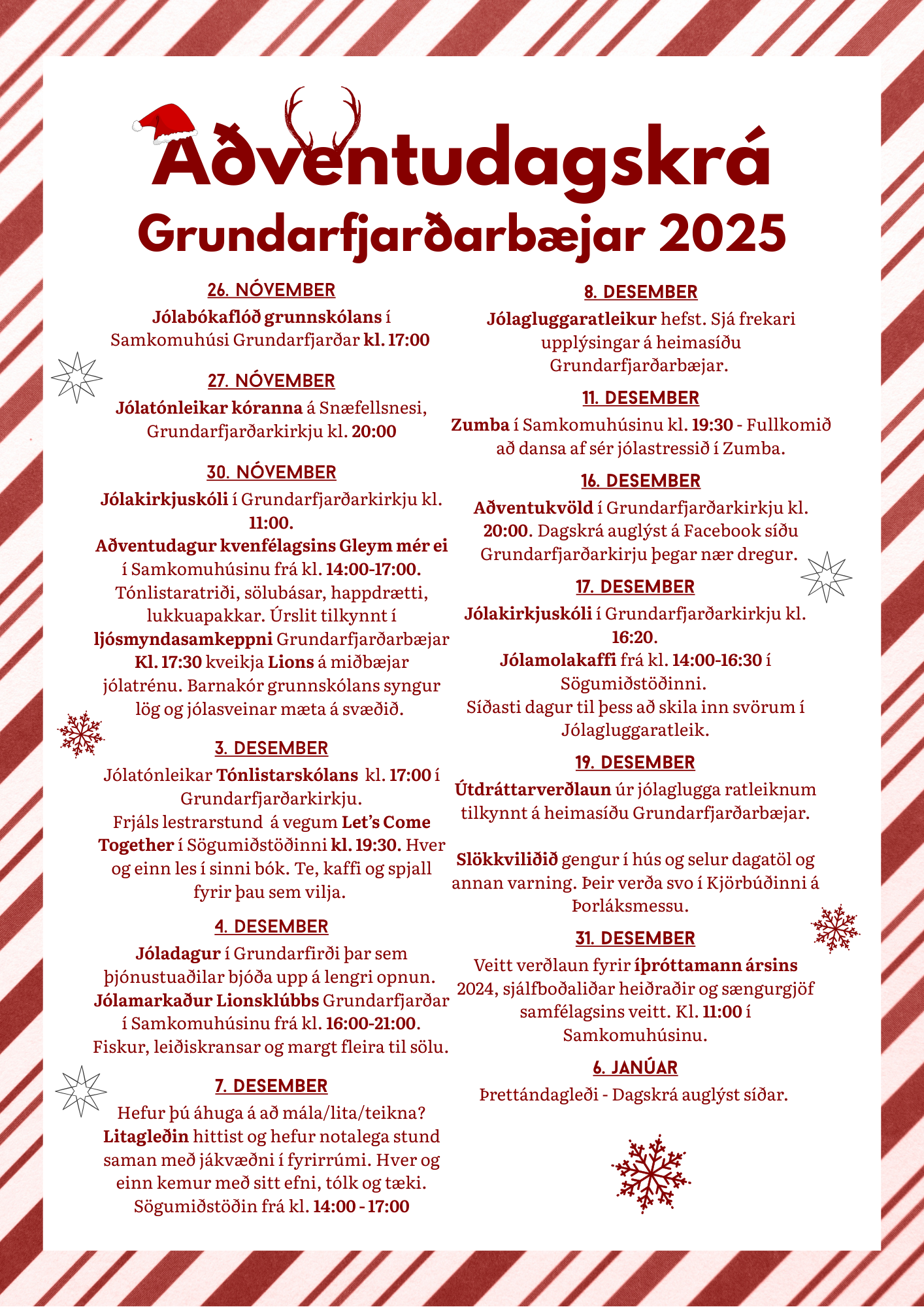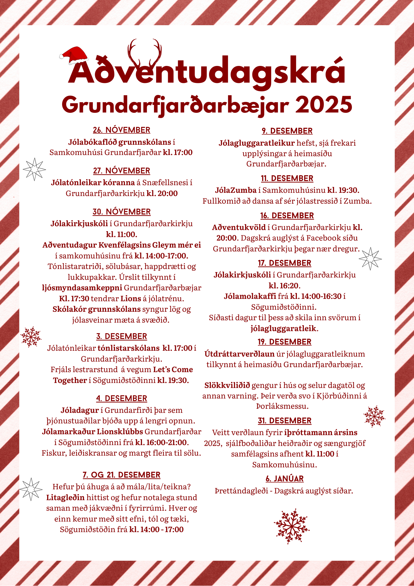 Aðventudagskrá Grundarfjarðarbæjar er nú tilbúin. Fyrirtæki, stofnanir og íbúar Grundarfjarðarbæjar hafa tekið höndum saman og er margt í boði fyrir alla á aðventunni. Hlökkum til að sjá ykkur sem flest á viðburðum á aðventunni.