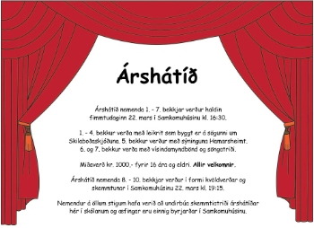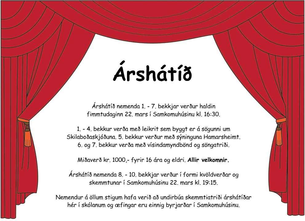 Árshátíð 1.-7. bekkjar Grunnskóla Grundarfjarðar verður haldin í Samkomuhúsi bæjarins fimmtudaginn 22. mars kl 16:30.