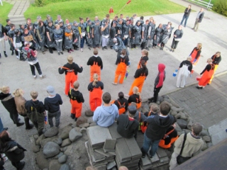 Það er mikið um að vera í Fjölbrautaskóla Snæfellinga í dag. Busavígslan stendur sem hæst og er líflegt um að litast í bænum. Eldribekkingar fóru með busana í göngutúr í bandi líkt og um leikskólabörn væri að ræða. Busarnir voru klæddir í svarta ruslapoka og sáust sumir íklæddir bleyjum ásamt því að vera vel smurðir af óþekktum efnum. Skrúðgangan kom við fyrir utan bæjarskrifstofuna og tóku busarnir lagið fyrir áheyrendur sem fengu að velja sér óskalag.