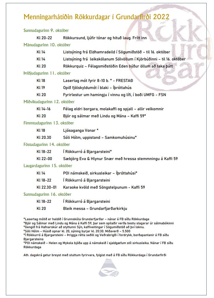 Menningarhátíðin Rökkurdagar 2022 verður haldin hátíðleg dagana 9. til 16. október nk. Hátíðin fór fyrst af stað árið 2001 og hefur verið fastur liður hér í Grundarfirði ár hvert í október- eða nóvember mánuði.