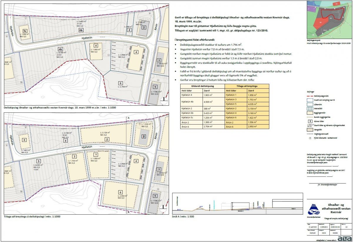Tillagan er í samræmi við gildandi Aðalskipulag Grundarfjarðarbæjar 2019-2039. Í meginatriðum felur hún í sér um 1800 m2 stækkun á deiliskipulagssvæðinu til suðurs og breytingar á og við götuna Hjallatún, þ.m.t. breytingar á breidd götunnar, lóðastærðum, lóðanúmerum, byggingarreitum og gönguleiðum.