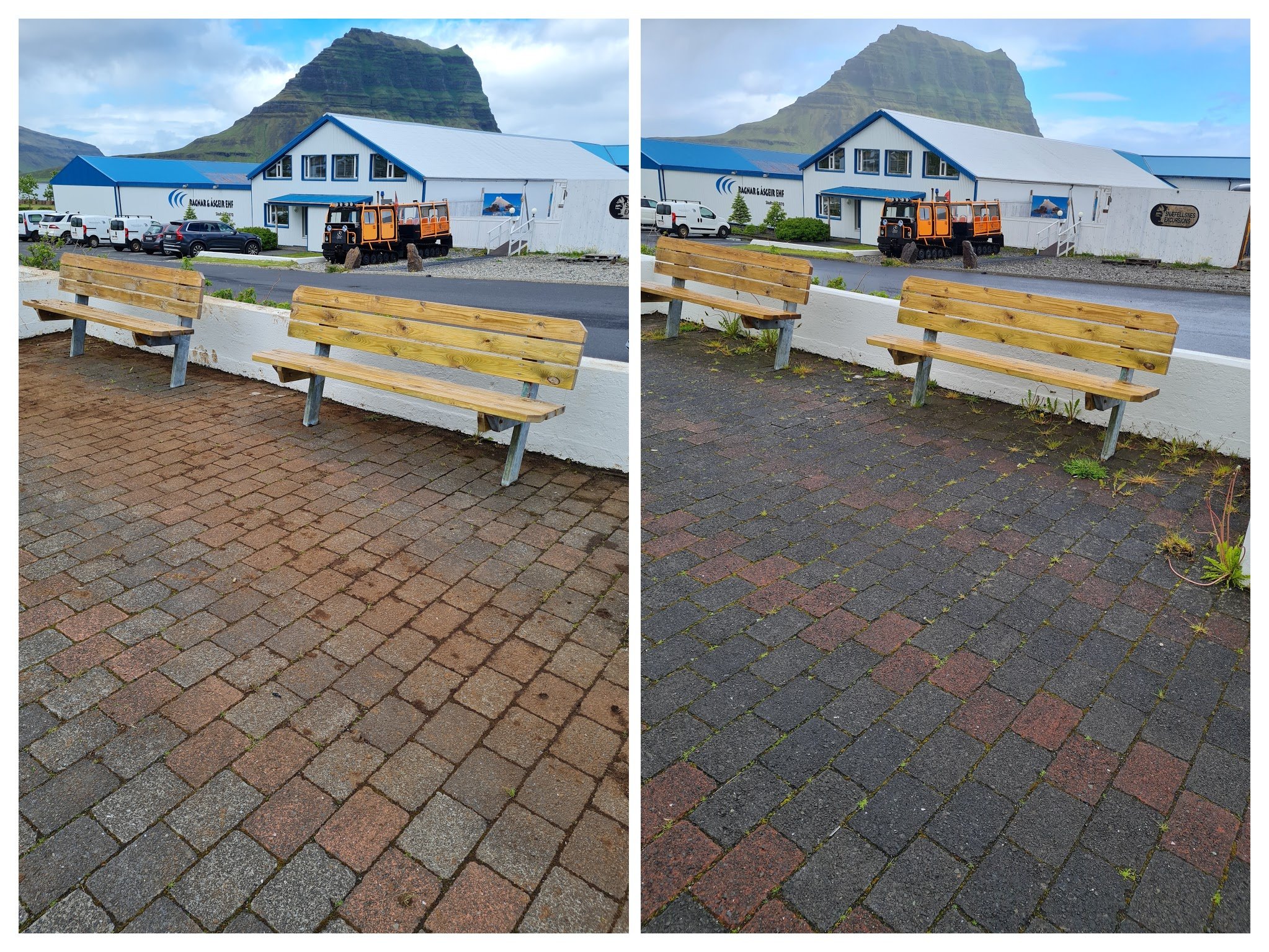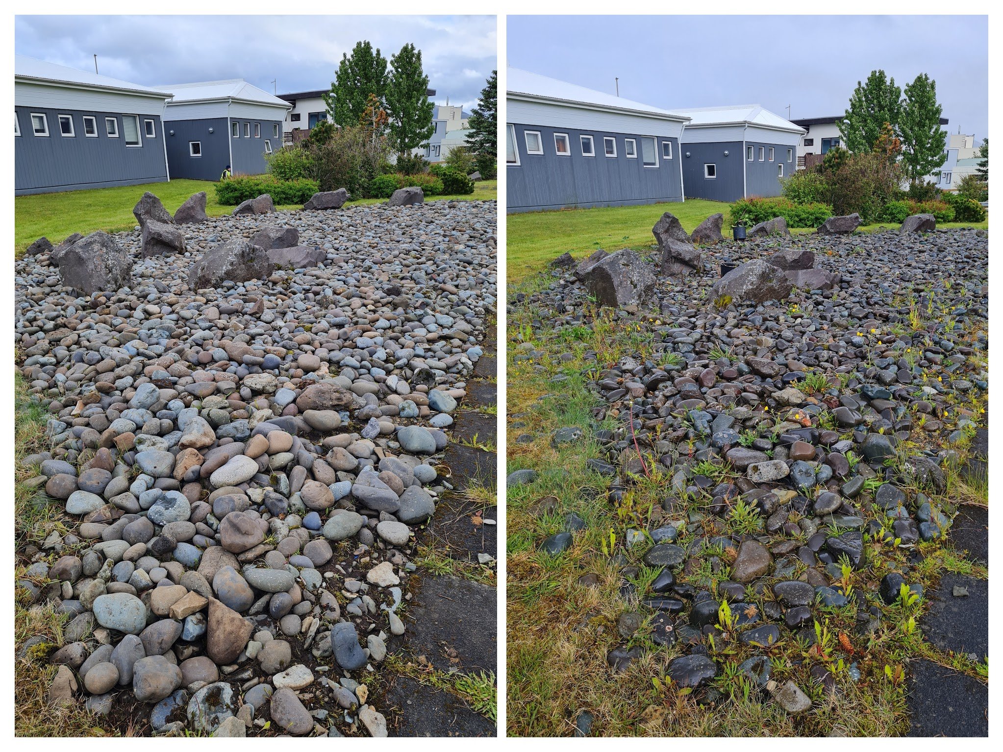 Í annarri vinnuviku var veðrið ekki alveg eins gott, en slapp allt saman til. Beðin við heilsugæsluna voru hreinsuð ásamt hellum á göngustíg og í grjóti.