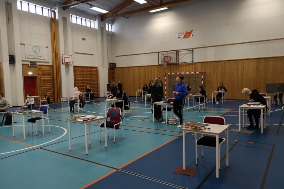 Mynd: Grunnskóli Grundarfjarðar í dag, nýtt fyrirkomulag - unglingum kennt í íþróttahúsinu. Sjá fleiri myndir hér á síðu skólans.