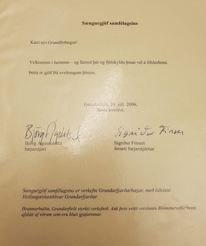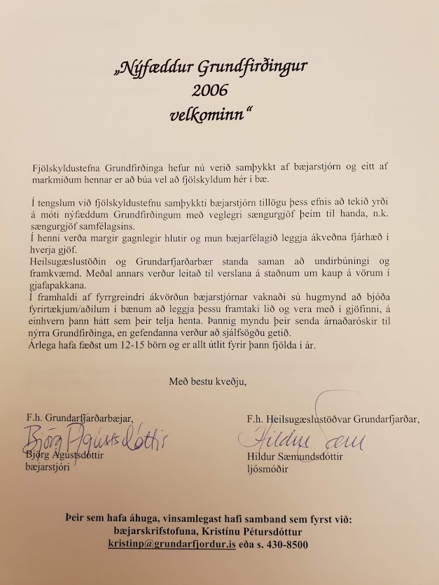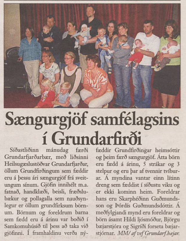 Þessa dagana eru liðin 15 ár síðan Grundarfjarðarbær og Heilsugæslustöðin Grundarfirði hófu að færa nýfæddum Grundfirðingum svonefnda "sængurgjöf samfélagsins". Hugmyndin vaknaði í vinnu sem staðið hafði yfir árið á undan við setningu fjölskyldustefnu Grundfirðinga. Eitt af markmiðum hennar var að hlúa vel að fjölskyldum í bænum.