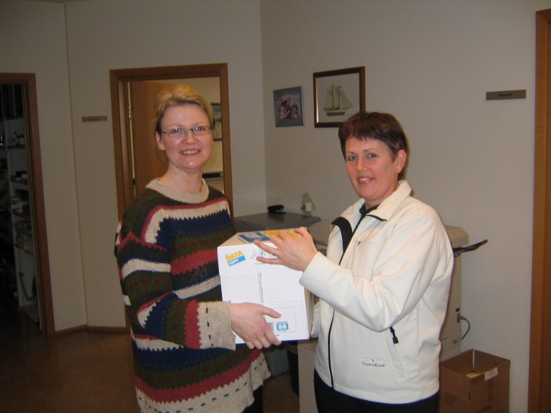 | Jóhanna Halldórsdóttir afhendir Björgu Ágústsdóttur bæjarstjóra, fyrsta kassann af umhverfisvænum pappír |