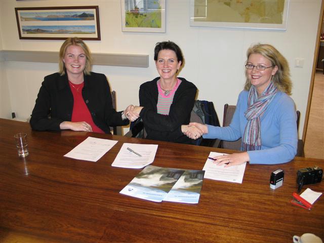 | Ingibjörg Valdimarsdóttir og Hafrún Þorvaldsdóttir frá OR og Björg Ágústsdóttir bæjarstjóri handsala samninginn |