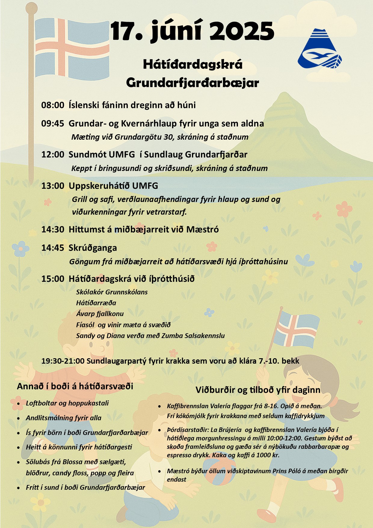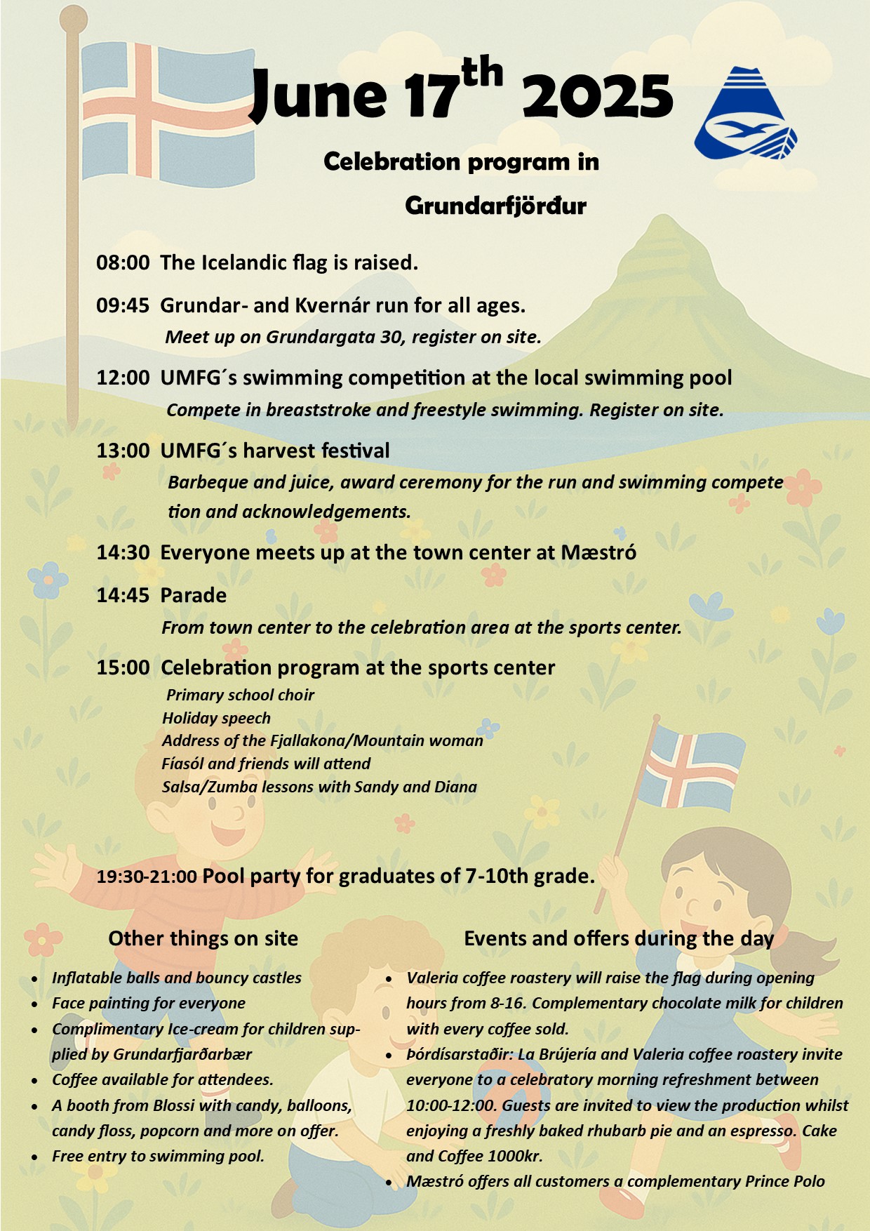 Þjóðhátíðardagur Íslendinga, 17. júní, verður haldinn hátíðlegur í Grundarfirði. Hefðbundnir liðir eru í bland við aðra nýrri, Grundar- og Kvernárhlaup fyrir hádegi og hátíðardagskrá við íþróttahúsið, sem hefst á skrúðgöngu kl. 14:30 frá miðbæjarreit við Mæstro. Skrúðgangan fer af stað kl: 14:45 með 9. bekk í fararbroddi sem munu sjá um að koma öllum í hátíðarskap, ásamt því að vera fánaberar.