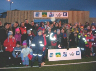 | Nemendur, fulltrúar KSÍ, bæjarstjórnarmenn, fulltrúar UMFG og fleiri stilltu sér upp að athöfn lokinni |