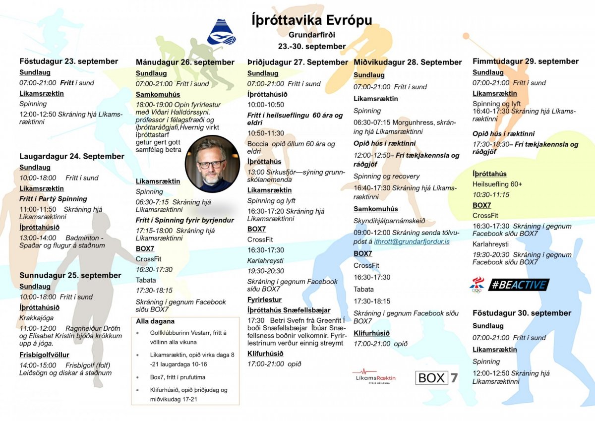 Föstudaginn 23. september fer af stað íþróttavika Evrópu. Grundarfjarðarbær tekur þátt í henni og í samstarfi við nokkra aðila hér í bæ höfum við sett saman dagskrá yfir þá viðburði sem verða þessa viku. Við hvetjum ykkur til að taka þátt og skoða hvað er í boði.
