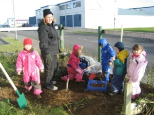 Það viðraði vel til að taka upp kartöflur í leikskólanum þriðjudaginn 25. september. En uppskeran er afrakstur að því útsæði sem Kaupþing gaf leikskólanum í vor til að setja niður.