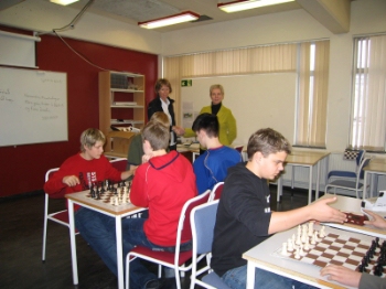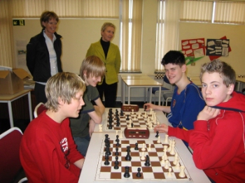 | Ingólfur Örn, Heimir Þór, Albert Þórir og Erling ánægðir með gjöfina frá KB banka. Á myndinni má einnig sjá Olgu Einarsd. og Önnu Bergsd. fylgjast með nemendum leika skák. |