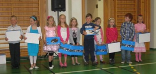 Kiwanishreyfingin á Íslandi færir árlega öllum 6 ára börnum reiðhjólahjálma að gjöf. Þessi vaski hópur Grundfirðinga var að vonum ánægður með framtakið.