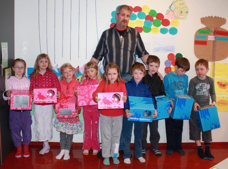 Fulltrúi Kiwanishreyfingarinnar í Snæfellsbæ kom færandi hendi í Grunnskóla Grundarfjarðar og færði 1. og 2. bekk veglega hjálma að gjöf, bleika fyrir stúlkurnar og bláa fyrir drengina. Nemendurnir voru himinlifandi yfir þessu enda má enginn vera á hjóli án þess að vera með hjálm.