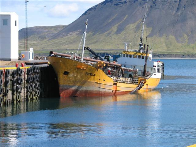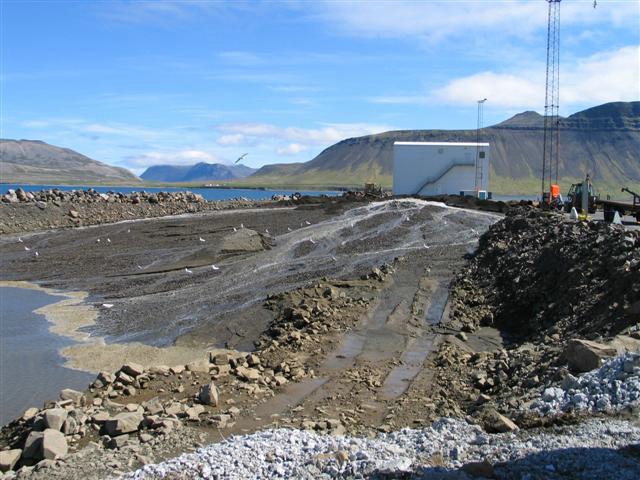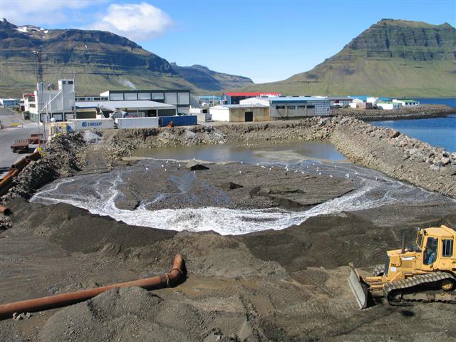 Vinna við landfyllingu við höfnina gengur vel. Sanddæluskipið Perla er nú að dæla um 30 þúsund rúmmetrum af efni í landfyllinguna. Gert er ráð fyrir að skipið verði hér eitthvað fram í næstu viku við dælingu.