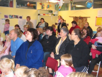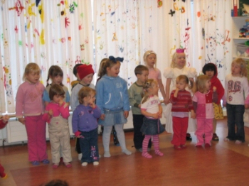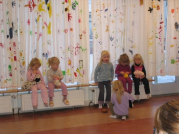 | Elstu og yngstu börnin á leikskólanum syngja saman |