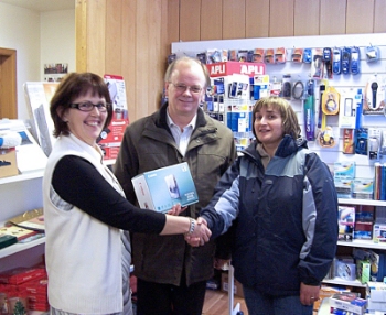 | Jóhanna í Hrannarbúðinni, Guðmundur Ingi bæjarstjóri og vinningshafinn, Alexandra Sukhova. Mynd HJJ. |