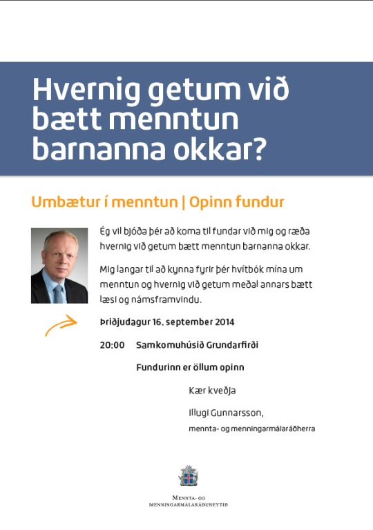 Illugi Gunnarsson býður Grundfirðingum að koma til fundar við sig og ræða um hvernig megi bæta menntun barna okkar. Hann ætlar að kynna hvítbók sína um menntun og hvernig megi bæta læsi og námsframvindu.