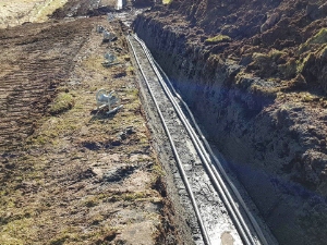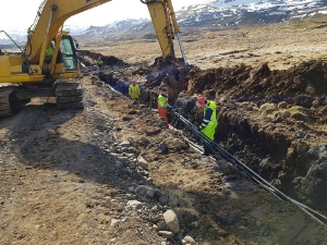 Vinna við Grundarfjarðarlínu 2, jarðstrengs á milli Grundarfjarðar og Ólafsvíkur, er hafin að nýju. Verkefnið hefur tekið lengri tíma en til stóð en vegna vetrarveðurs þurfti Steypustöð Skagafjarðar að stöðva lagningu strengsins. En þeir hjá Steypustöðinni sátu ekki auðum höndum og náðu að undirbúa allar þveranir og vinnuslóða í vetur.