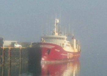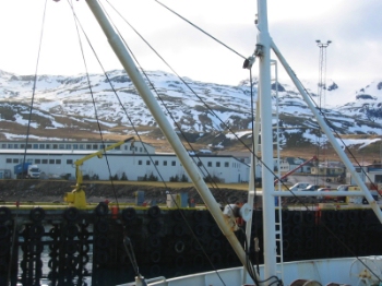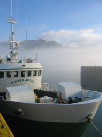 Akureyrin EA, skip Samherja frá Akureyri, kom inn til löndunar í Grundarfjarðarhöfn upp úr hádegi í dag. Skipstjórinn, sem er uppalinn í Grundarfirði, sigldi þá í fyrsta sinn til hafnar í sínum gamla heimabæ, reyndar í þykkri þoku og þurfti að hafa fyrir því að sannfæra áhöfn sína um að víst væri Kirkjufellið fallegasta fjallið.... sem kom reyndar í ljós nokkru síðar þegar þokunni létti.