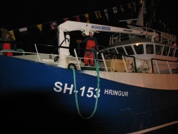 Fjöldi manns var mættur á stóru bryggjuna í Grundarfirði fyrir birtingu um kl. 10 á gamlársdagsmorgun þegar Hringur SH 153 nýtt togskip Guðmundar Runólfssonar hf. renndi upp að bryggjukantinum. Þar sem það var gamlársdagur þótti tilhlýðilegt að taka á móti því með flugeldasýningu.