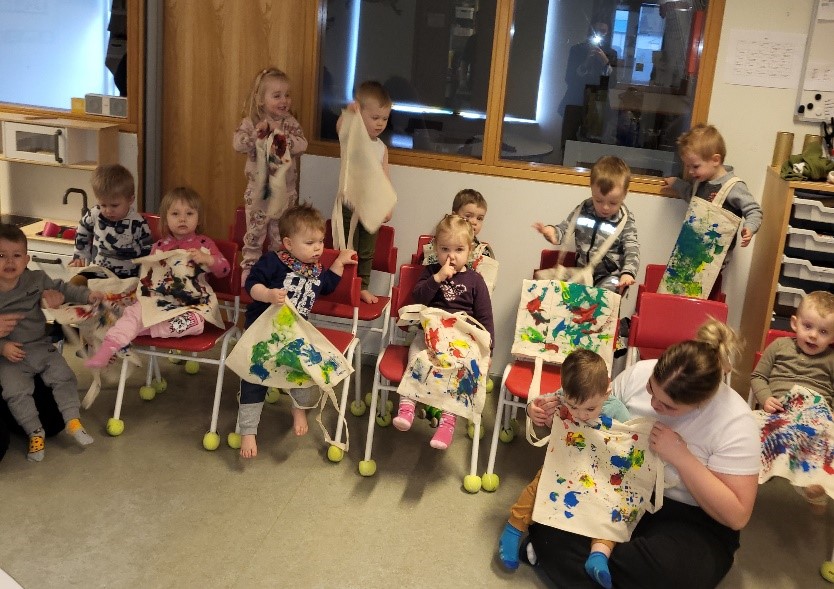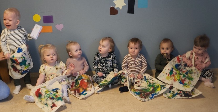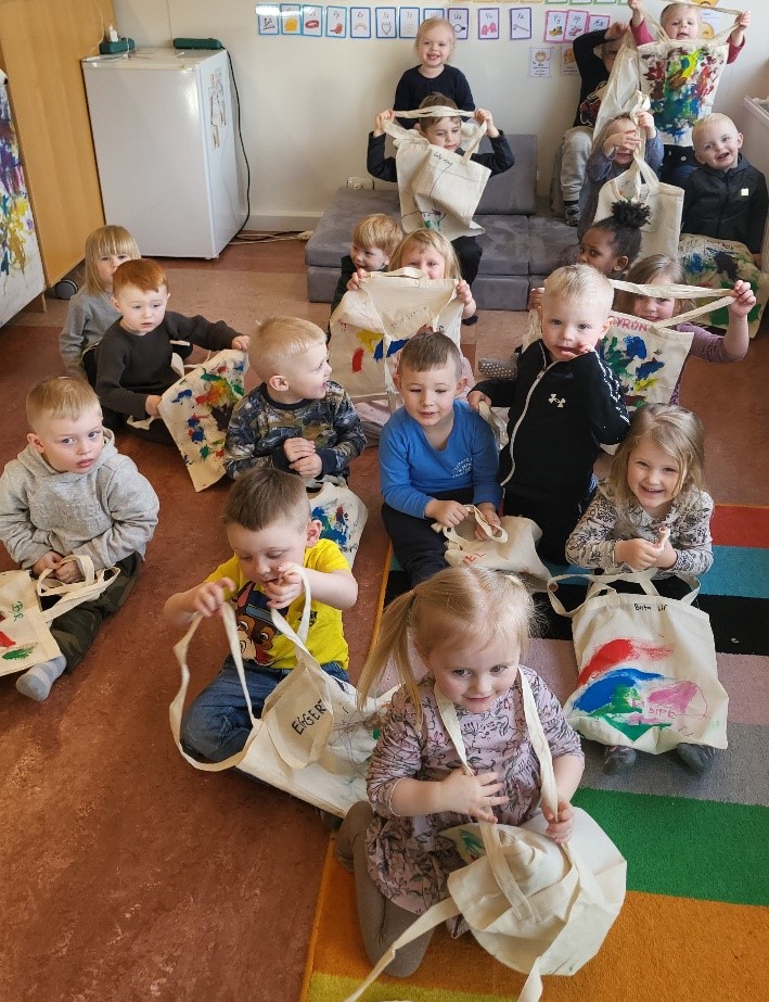 Keyptir voru fjölnota taupokar fyrir börnin á Sólvöllum þar sem þau fengu að skreyta pokann sinn með málningu og litum. Tilgangurinn með þessu er að leikskólinn taki skref í áttina að því að verða umhverfisvænni og minnki plastpoka.