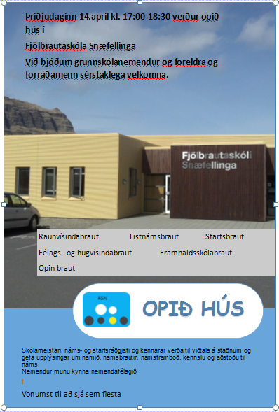 Þriðjudaginn 14. apríl kl.17:00-18:30 verður opið hús í Fjölbrautaskóla Snæfellinga.