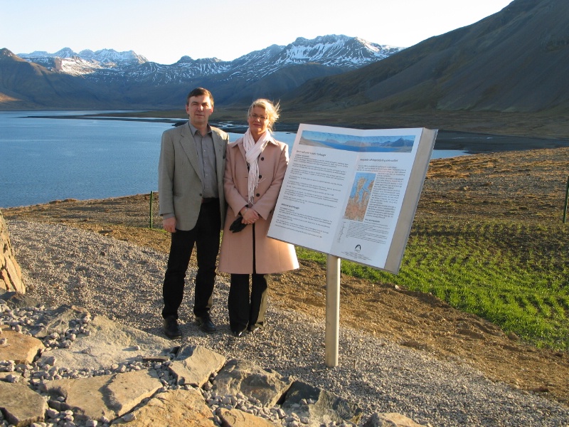 Hermann Jóhannesson Eyrbyggi og Björg Ágústsdóttir bæjarstjóri við skiltið |