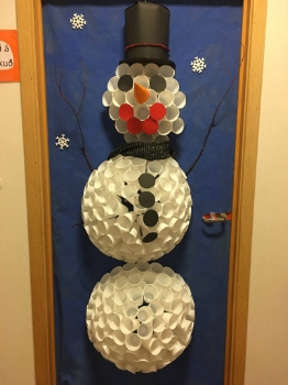| Þessi frumlegi og skemmtilegi snjókarl prýddi hurðina sem hlaut þriðju verðlaun. |