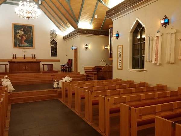 Í kirkjuskipi Grundarfjarðarkirkju hanga skírnarkjólar sem Grundfirðingar hafa búið til og verið skírðir í.
