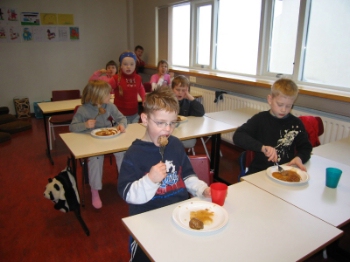 | Það voru kjötbollur á boðstólum þegar ljósmyndara bar að garði. Hér eru nemendur í heilsdagsskóla í hádegismat. |
