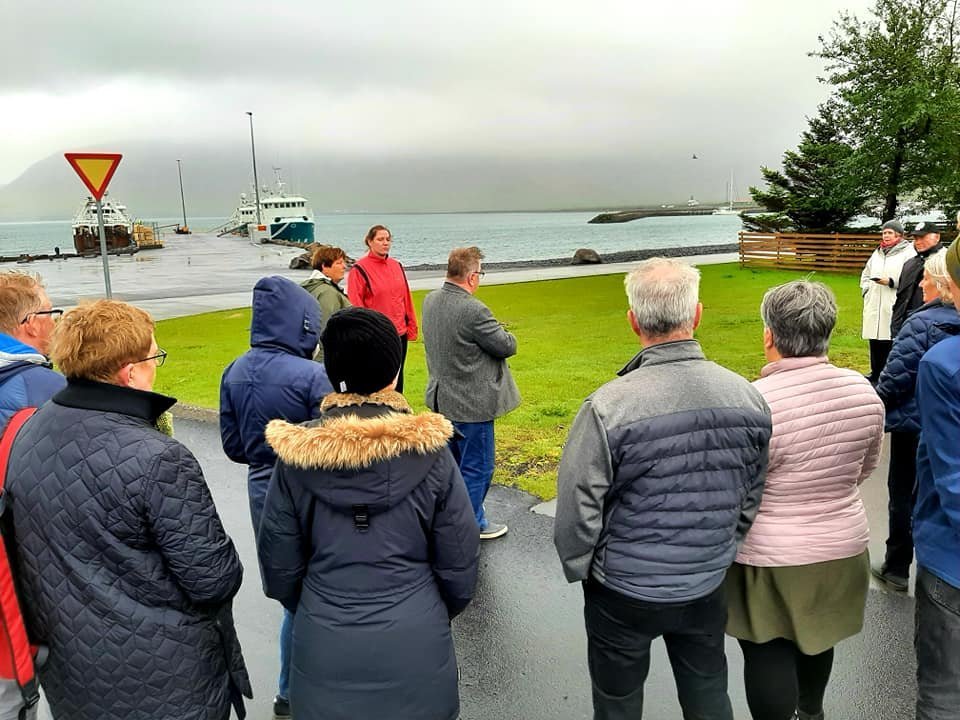 Byrjað var í Sögumiðstöðinni þar sem veðrið var okkur ekki hliðhollt, síðan farið niður í pláss á þær slóðir sem uppbyggingin hófst og farið yfir þá sögu. Því næst var haldið aftur upp í Sögumiðstöð, allir rennblautir og kátir eftir hressandi gönguför og skemmtilega fræðslu.