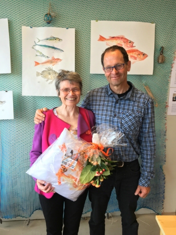 Listakonan Josée Conan frá Paimpol, vinabæ Grundarfjarðar í Frakklandi, var viðstödd opnun sýningar sinnar í Sögumiðstöðinni í gær. Verk hennar af fiskum og öðru sjávarfangi hafa vakið mikla athygli og var svo sannarlega við hæfi að opna sýninguna á sjómannadaginn hér í Grundarfirði.