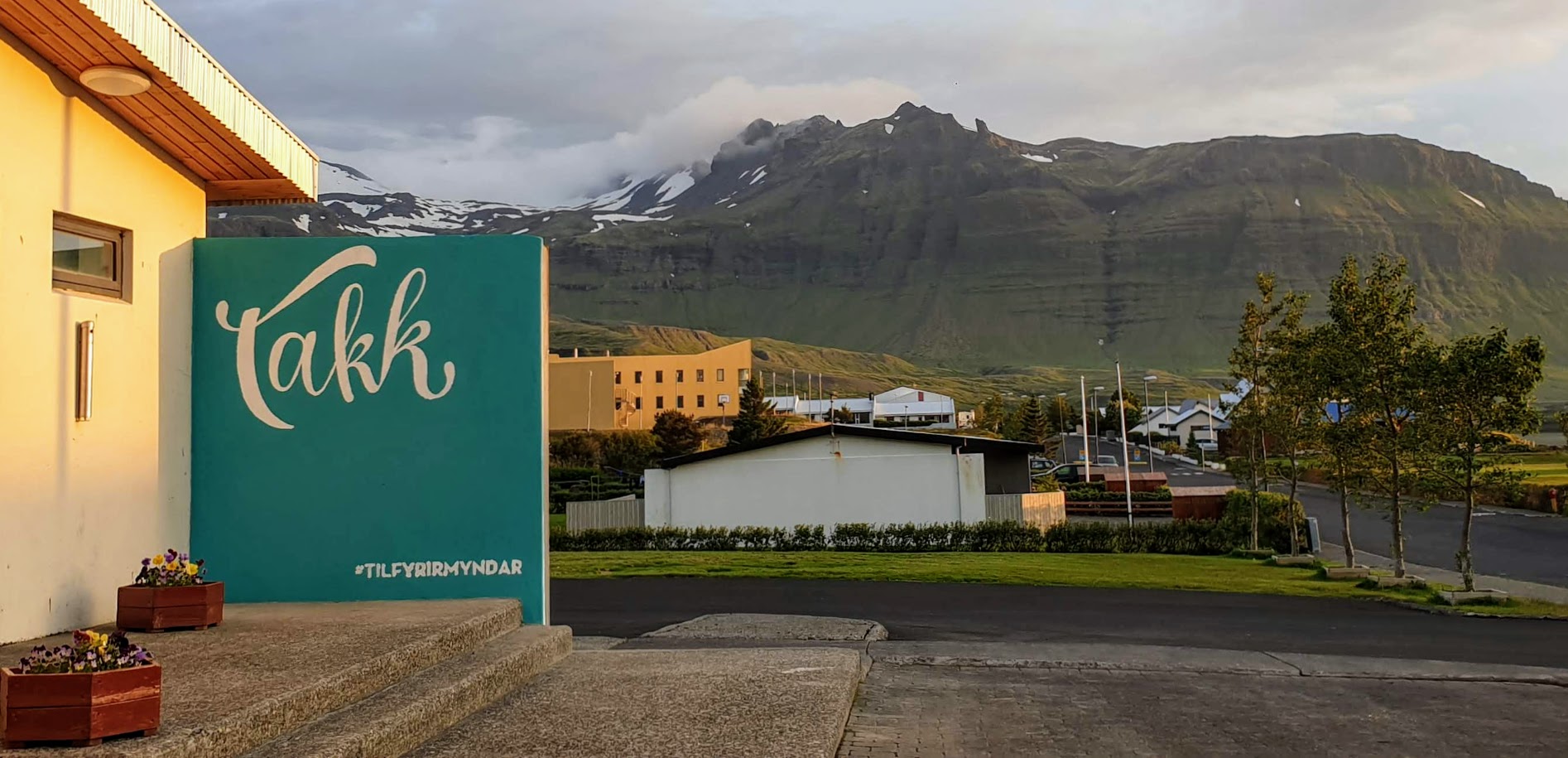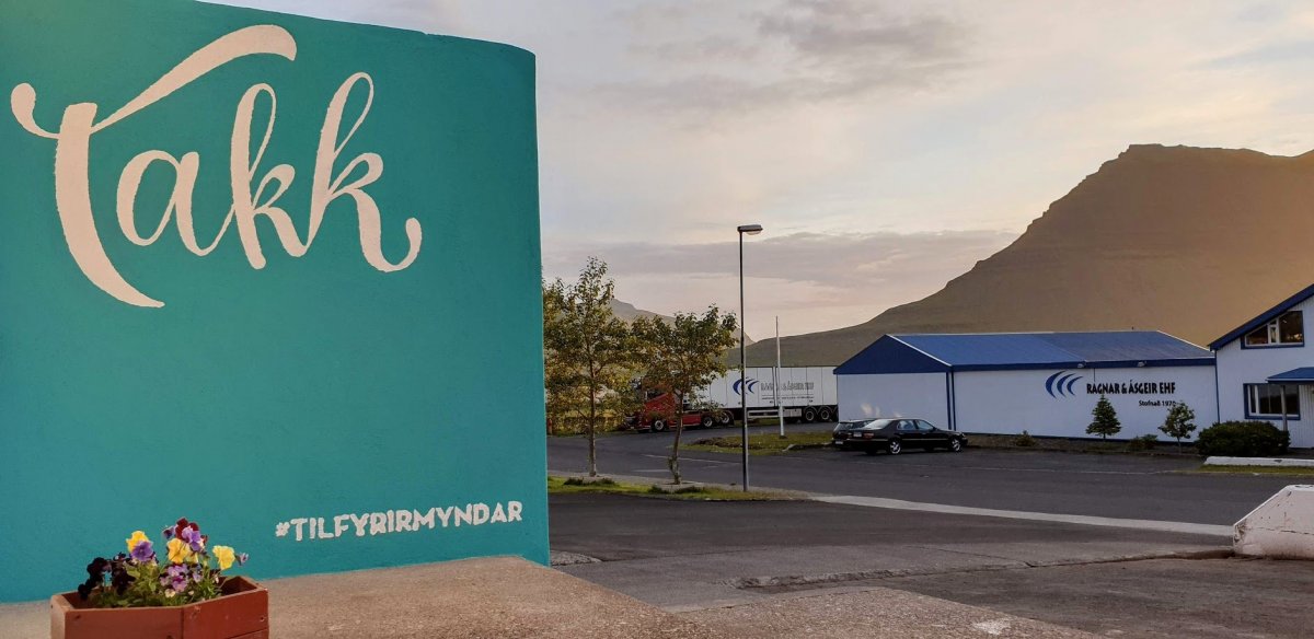Við Samkomuhúsið, Sólvöllum 3, í Grundarfirði er búið að mála "takk-vegg".
