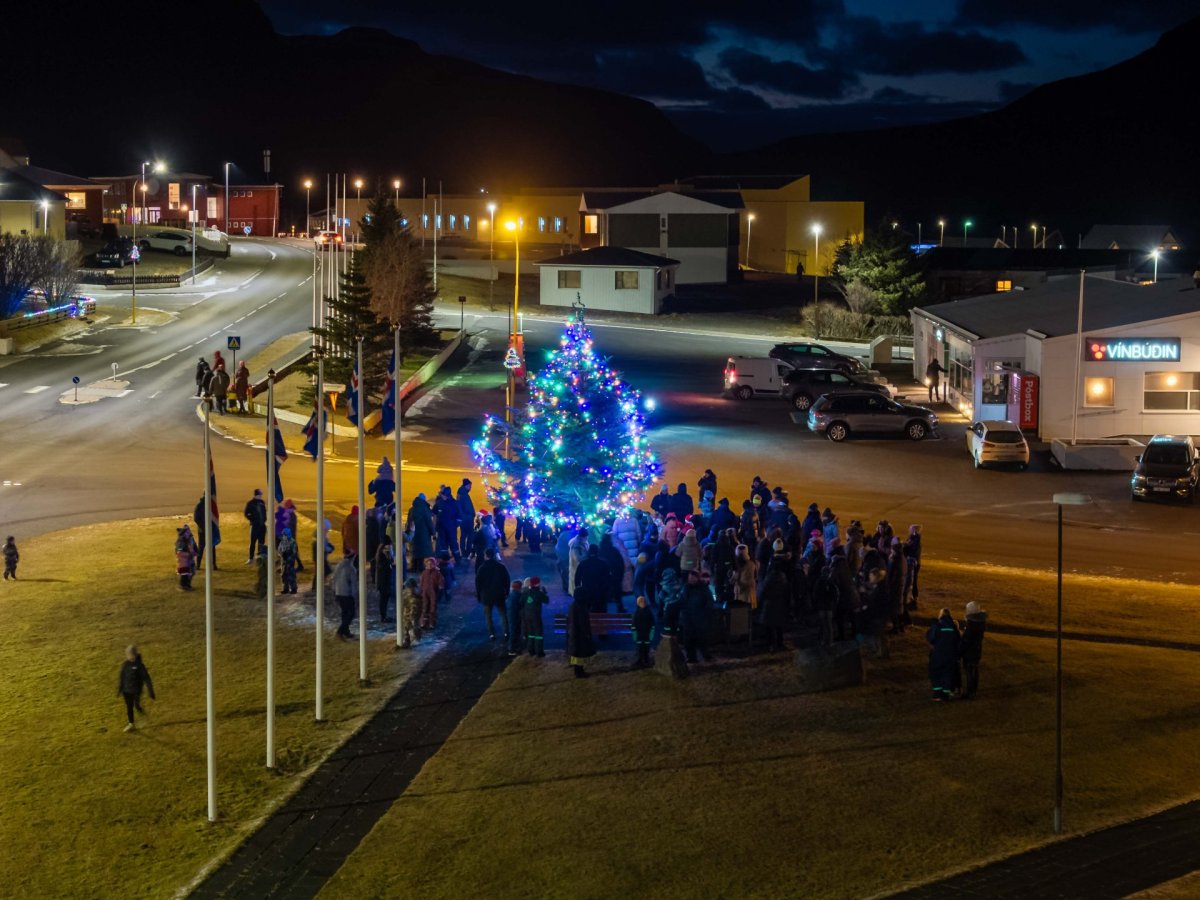 Sunnudaginn 1. desember sl., fyrsta sunnudag í aðventu, var kveikt á jólatrénu í miðbænum. Barnakór grunnskólans söng nokkur lög og jólasveinarnir kíktu við með mandarínur handa kátum krökkum. Við þökkum þeim kærlega fyrir sem og félögum í Lions fyrir að sjá um að útvega þetta fallega tré og setja það upp með ljósum.
