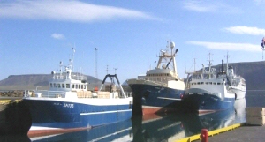 | Þétt skipað í höfninni í morgun. Auk skemmtiferðaskipsins má sjá Helga SH, Harðbak EA og Hring SH. |