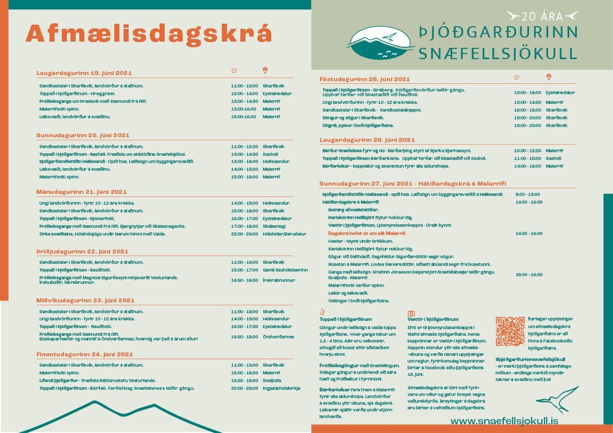 Þjóðgarðurinn Snæfellsjökull verður 20 ára þann 28. júní nk og í tilefni af því verður heil vika af allskonar viðburðum í gangi.
