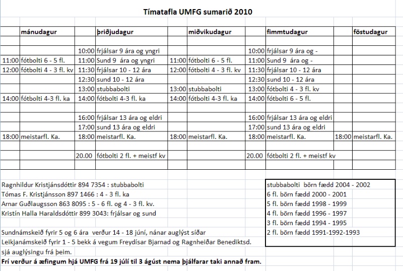 Búið er að setja inn tímatöflu UMFG fyrir sumarið 2010. Töfluna má skoða undir flipanum "íþróttir" og einnig hér.