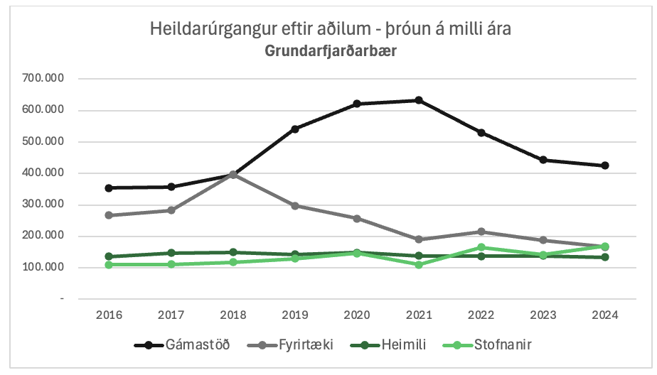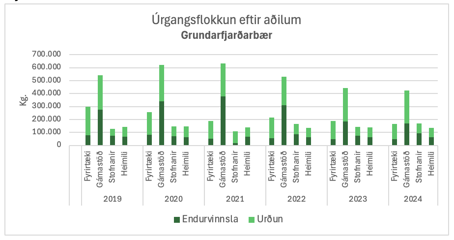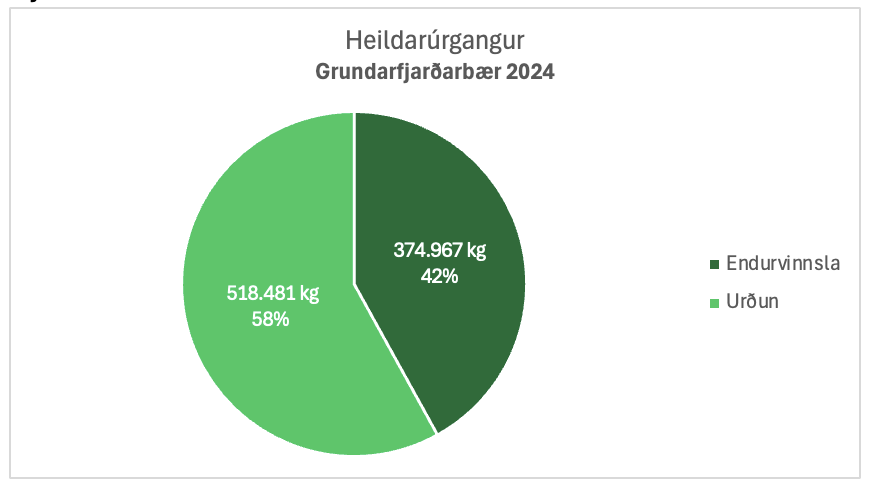 Sérsöfnun úrgangs hefur verið í Grundarfirði frá árinu 2011 og gengið vel, eins og myndirnar hér að neðan sýna. Endurvinnsluhlutfall heildarúrgangs í sveitarfélaginu hefur almennt verið á bilinu 40–50% og úrgangur til endurvinnslu frá heimilunum yfirleitt verið rétt undir 50%. Þótt gott endurvinnsluhlutfall frá heimilum sé jákvætt, er stærra verkefni fram undan í samfélaginu sem heild. Í umræðu um endurvinnslu, sérsöfnun og flokkun gleymist oft að ræða sorpmyndun sjálfa – það magn sem til fellur. Mikilvægasta leiðin til að minnka bæði umhverfisáhrif og kostnað vegna sorps er að draga úr innkaupum og þar með sorpmyndun.