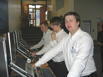 | Björn Ásgeir, Guðlaugur og Sigmar úr stjórn nemendafélags FSN, og starfsmenn á UT, kynntu sér tölvubúnað frá EJS. |