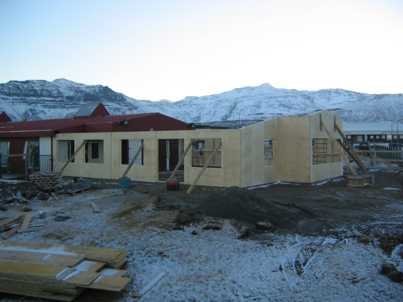 Vinna við viðbyggingu Leikskólans gengur vel, en í vikunni voru veggjagrindur reistar. Reiknað er með að viðbyggingin verði fokheld um miðjan janúar 2006. Meðfylgjandi mynd var tekin í vikunni þegar búið var að reisa veggina.