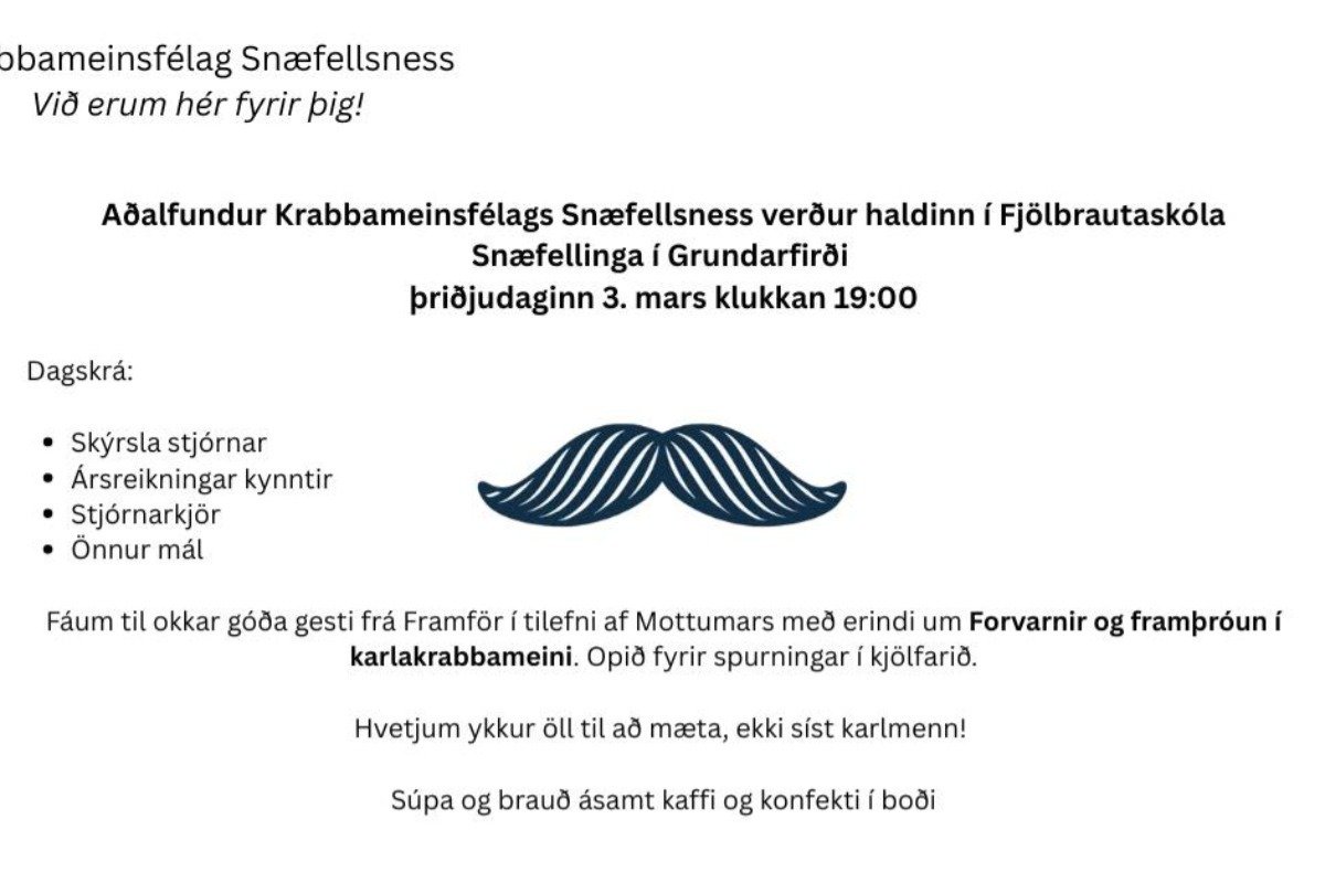 Aðalfundur Krabbameinsfélags Snæfellsness verður haldin i Fjölbrautaskóla Snæfellinga þriðjudaginn 3. mars kl. 19:00. Á aðalfundinn fáum við góða gesti frá Krabbameinsfélaginu Framför með erindi um Forvarnir og framþróun í karlakrabbameini. Hvetur ykkur öll til að mæta og ekki síst karlmenn.
