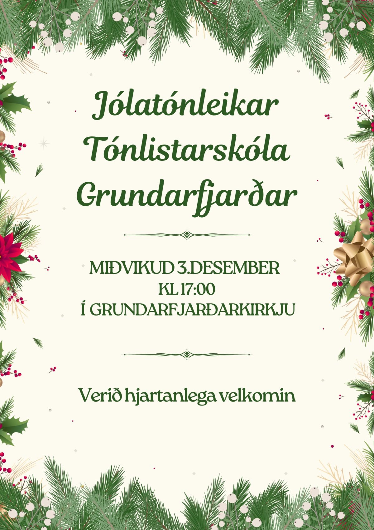 Jólatónleikar Tónlistarskóla Grundarfjarðar verða haldnir í Grundarfjarðarkirkju miðvikud 3.desember kl 17:00. Aðgangur ókeypis - Verið hjartanlega velkomin