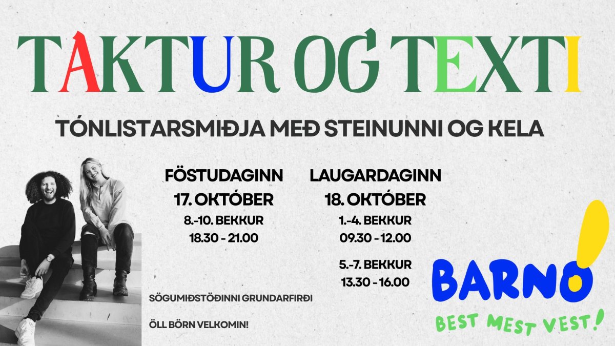 Taktur og texti er tónlistarsmiðja sem Steinunn Jónsdóttir og Hrafnkell Örn Guðjónsson leiða. Smiðjan er byggð á lagasmíða áfanga sem þau kenna í Fellaskóla þar sem raftónlist mætir íslenskri textagerð. Þátttakendur semja saman takt í tölvuforriti og texta við með dyggri aðstoð leiðbeinandanna. Lagið verður síðan bæði tekið upp.