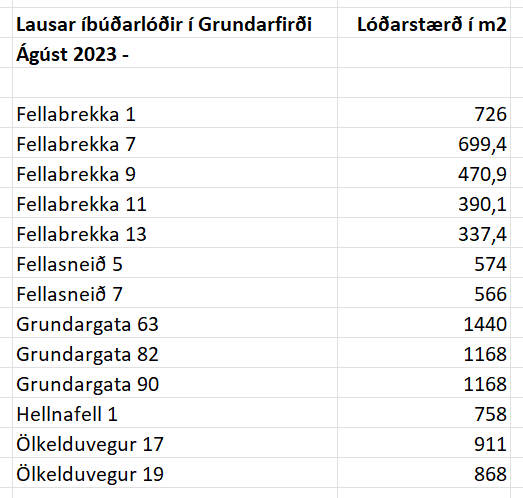 Listi yfir lausar íbúðarlóðir með afslætti gatnagerðargjalda og lóðarstærðir: